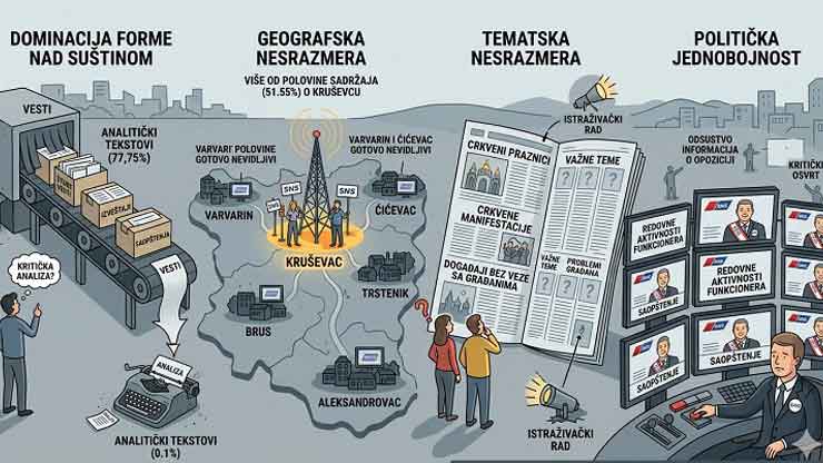 Istraživanje pod nazivom „Analiza sadržaja, kvaliteta, količine i vrste objavljenih medijskih priloga“ pokazalo je izraženu centralizaciju. Više od polovine svih sadržaja (51,55%) odnosi se isključivo na grad Kruševac, dok su opštine poput Varvarina i Ćićevca gotovo nevidljive u medijskom prostoru.
